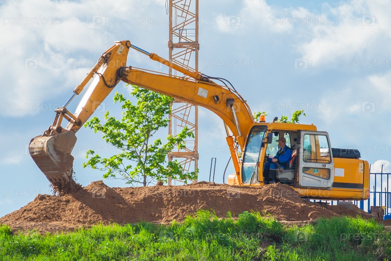 Экскаватор и башенный кран на строительной площадке