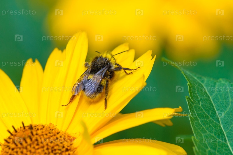 Шмель на желтом цветке ромашки на фоне сада в размытии (малая глубина резкости, макро)
