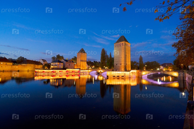 Мост Понтс-Кувертс в Страсбурге ночью, Франция