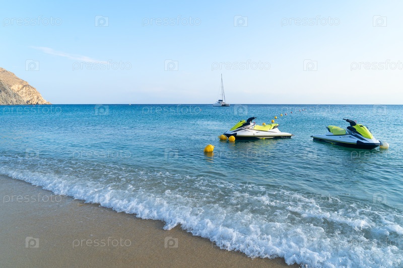 Турецкая вода и летний пляж с шезлонгами, остров Миконос, Греция