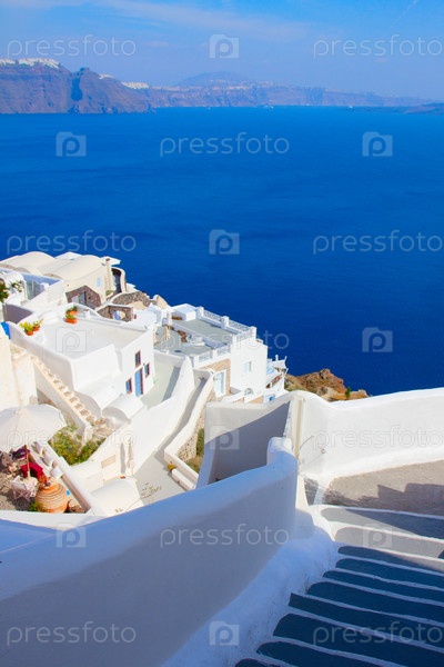 Крутая ступенька и греческие вазы, красивые детали острова Санторини, Греция