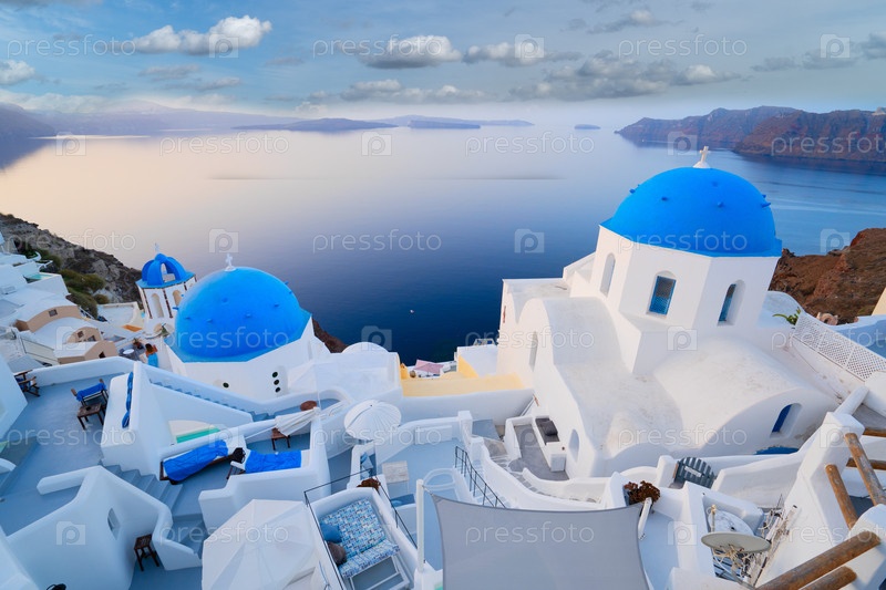 Традиционная греческая деревня Оя Санторини, с голубыми куполами церквей и деревенскими крышами, Греция