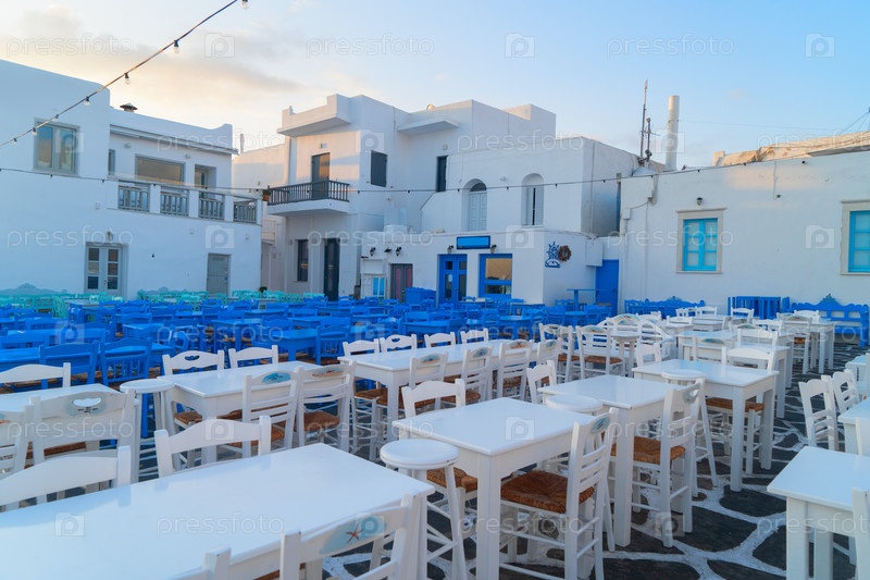 Гавань деревни Наусса с причальными лодками и синими столиками кафе
