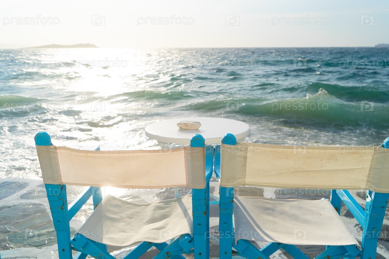 Приморское кафе на острове Миконос, Греция летом с солнечным светом