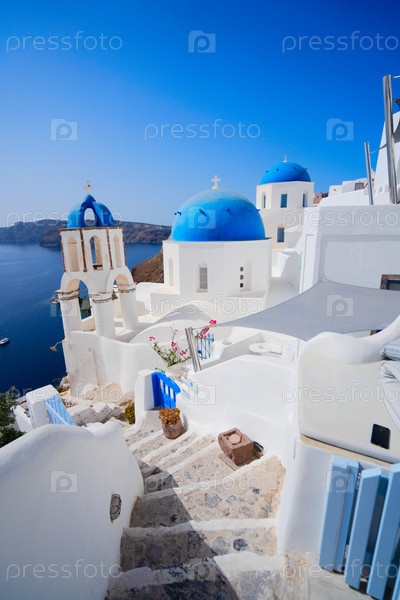 Традиционная греческая лестница в деревне Оя Санторини, с лестницей и синим куполом, Греция