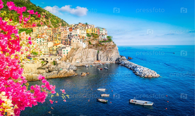 Манарила живописный город Чинкве-Терре с цветами, Италия