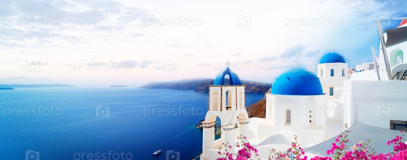 Традиционная греческая деревня Оя Санторини, с голубыми куполами против моря и кальдеры, Греция, веб-баннер
