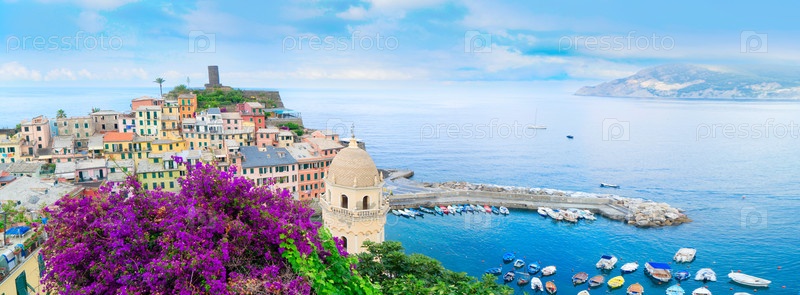 Вид на живописный город Вернацца и гавань Чинкве Терре сверху, Италия, формат веб-баннера