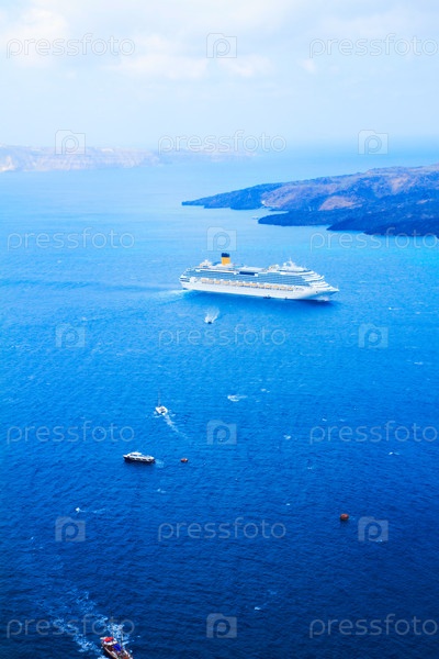 Тира и кальдера вулкана Санторини с кораблями, Греция