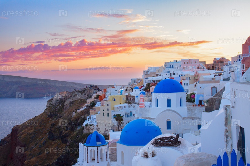 Городской пейзаж Оиа, традиционная греческая деревня Санторини, с голубыми куполами церквей, закрывающихся на закате, Греция