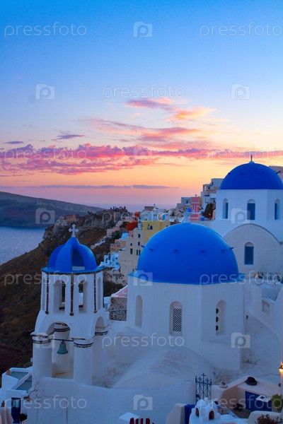 Городской пейзаж Оиа, традиционная греческая деревня Санторини, с голубыми куполами церквей, закрывающихся на закате, Греция