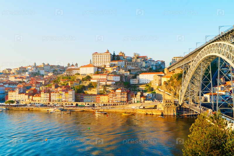 Живописный, красочный вид на старый город Порту со знаменитым мостом, Португалия с мостом Понте Дом Луис над рекой Дору. Опорто, туристический средиземноморский город