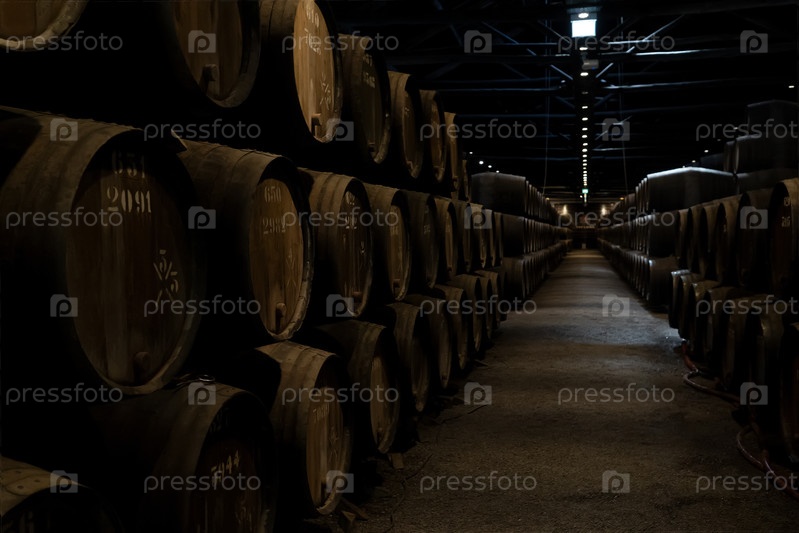 Винный погреб, ряд деревянных бочек закрывают
