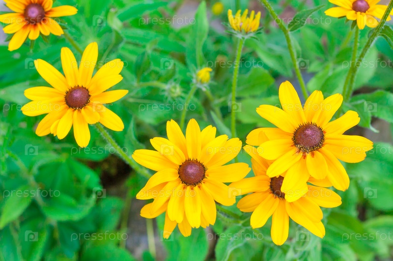 Вид сверху на желтые ромашковые цветы в зеленом саду