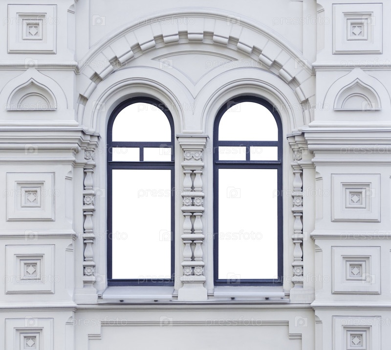 Закрытый вид на фасад белого древнего здания с двумя отдельными арочными окнами