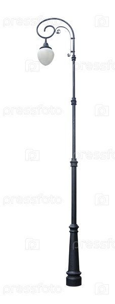 Блэк-металлический фонарный столб в винтажном стиле с изогнутым верхом и декоративным украшением, изолированный на белом фоне (элемент дизайна)