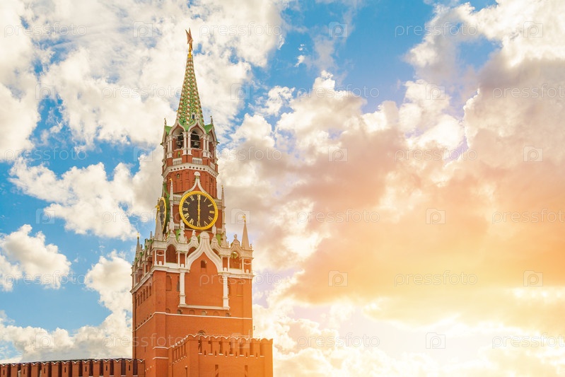 Вид на Спасскую башню Московского Кремля (Россия) против солнечного света с копировальным пространством