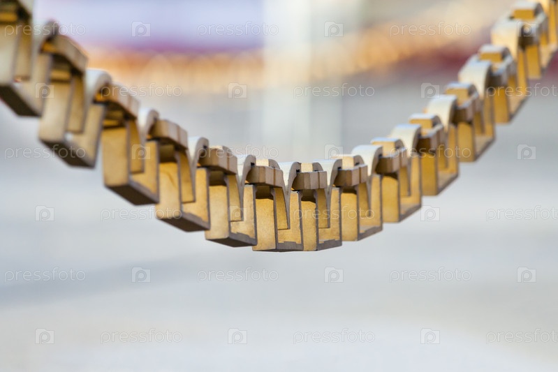 Позолоченная железная цепь на нейтральном фоне (концепция, неглубокая глубина резкости)