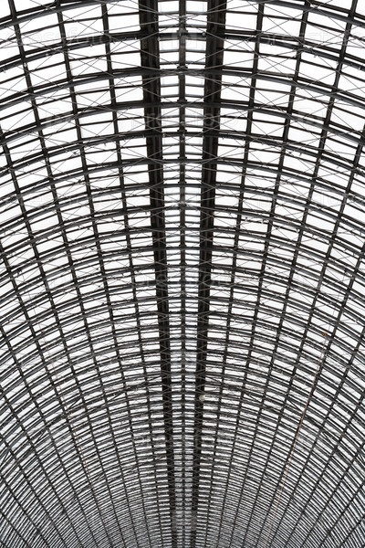 Перспективный взгляд на полусферический потолок из стекла и металла в современном здании как фон, фактура, абстрактная (вертикальная ориентация)