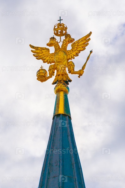 Золотой герб, двуглавый орел, Российской Федерации на вершине Кремлевской башни против серого пасмурного неба