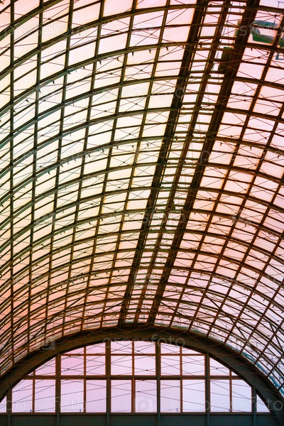 Вид на полусферический потолок из стекла и металла в современном здании на фоне оранжевого солнечного света