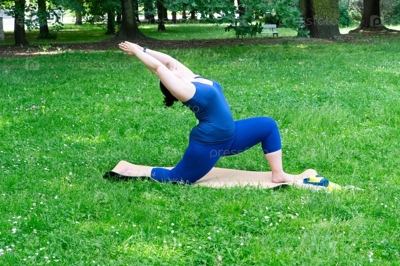 Женщина и спорт, упражнения для растяжки и похудения на свежем воздухе. Счастливая кривая 40-летняя женщина, занимающаяся тренировками, растягивает рутину на открытом воздухе в городском парке