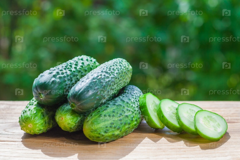 Закройте вид на груду свежих огурцов, цельных и нарезанных на деревянном столе, освещенных солнечным светом на фоне зеленого сада в размытии (небольшая глубина резкости)