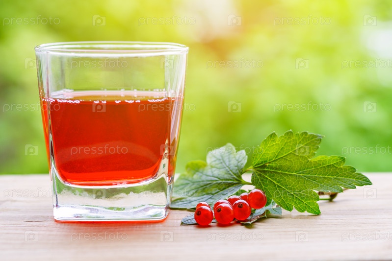 Стакан с красным соком смородины и ветка ягод с листьями на деревянном столе, освещенном солнечным светом, на фоне зеленого сада в размытом с копиркой пространстве (медленная глубина резкости, тонированный)