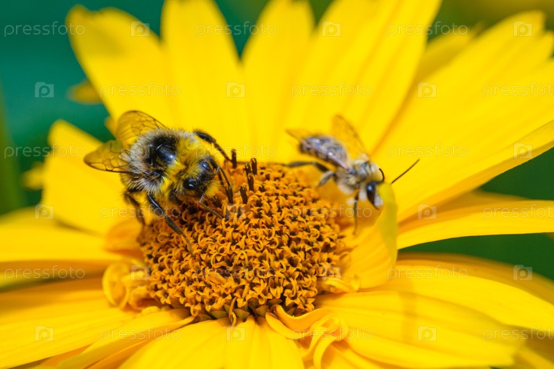 Шмели и пчелы на желтом ромашковом цветке (медленная глубина резкости, макро)