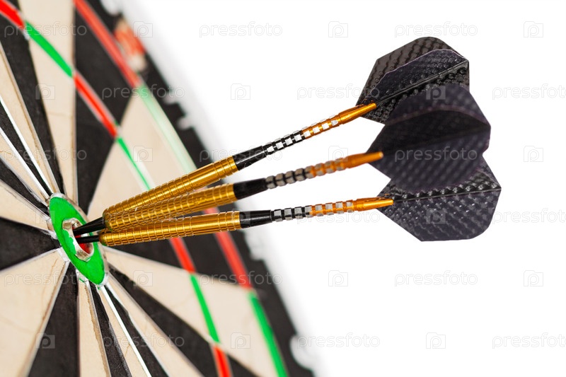 Закрыть вид на фрагмент профессиональной сизальной дроссельной доски с тремя позолоченными стрелками в центре (bullseye), изолировать на белом фоне (mock up)