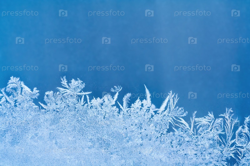 Морозный узор на синем оконном стекле с копированием пространства