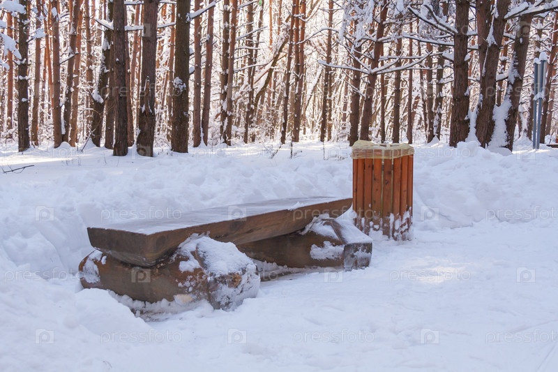 Деревянная скамейка с мусорным баком в зимнем лесу