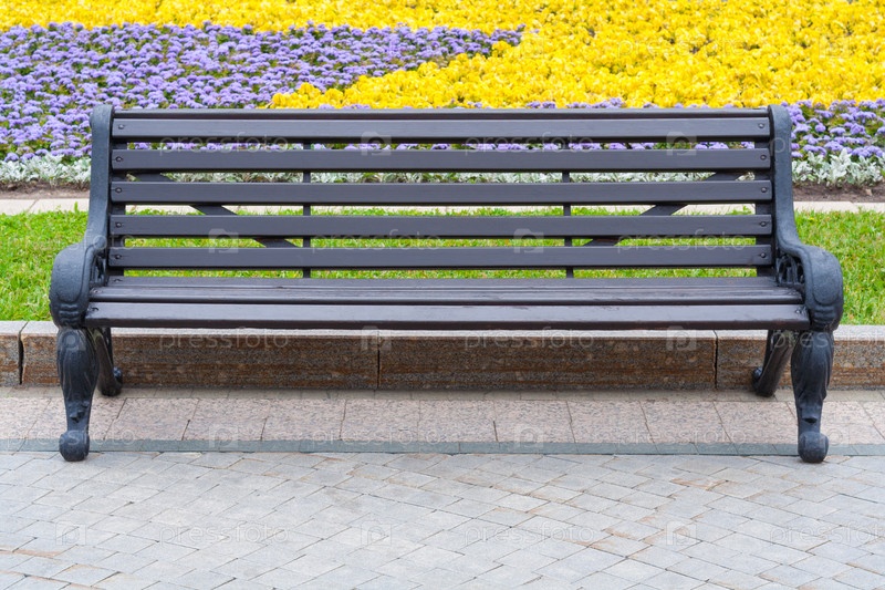 Вид спереди на серую деревянную скамью с коваными железными ногами в городском парке на фоне зеленой лужайки с цветными цветами