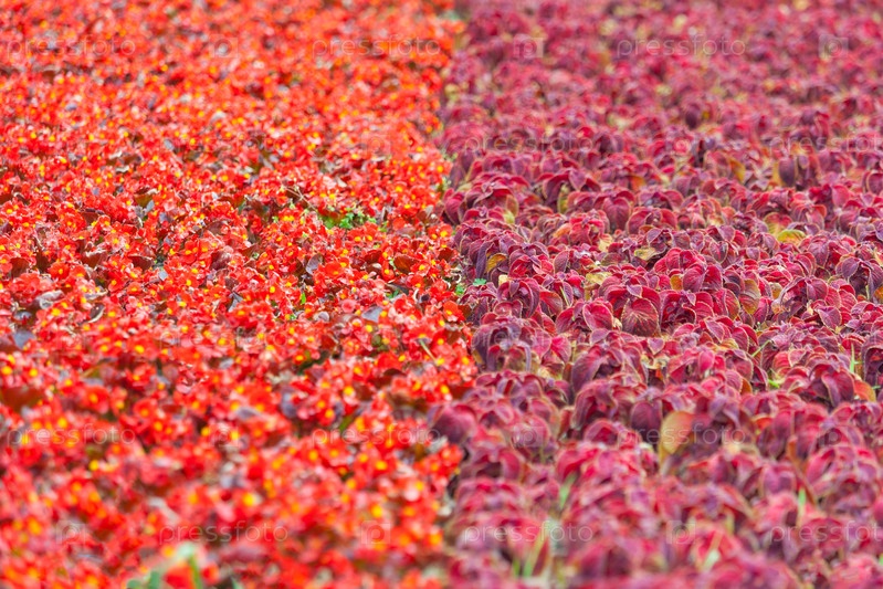 Абстрактный вид на поле красных цветков бегонии и фиолетовых декоративных листьев растения колея в качестве фона, текстуры (медленная глубина резкости, копировальное пространство)