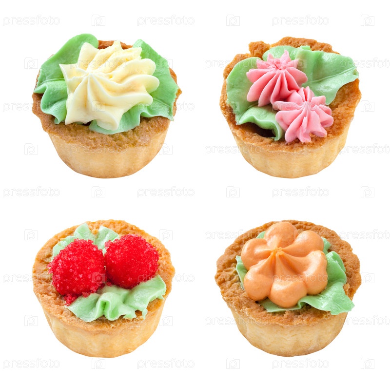 Набор из четырех корзинок с кремом в форме цветов и ягоды сверху изолирован на белом фоне (элемент дизайна)
