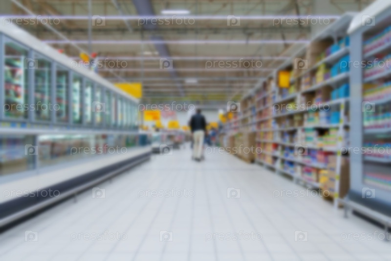 Перспективный вид размытого интерьера крупного супермаркета с потребителем (фон)