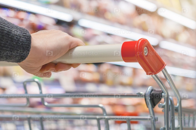 Закройте вид на женскую руку с тележкой в супермаркете. Стеллажи с потребительскими товарами размыты. Малая глубина резкости
