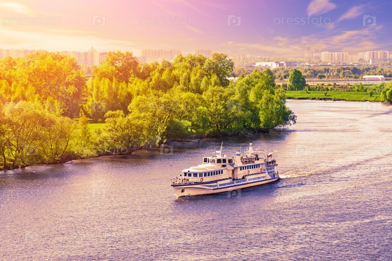 Вид с воздуха на небольшой круизный корабль, плавающий по реке на фоне фиолетового заката неба