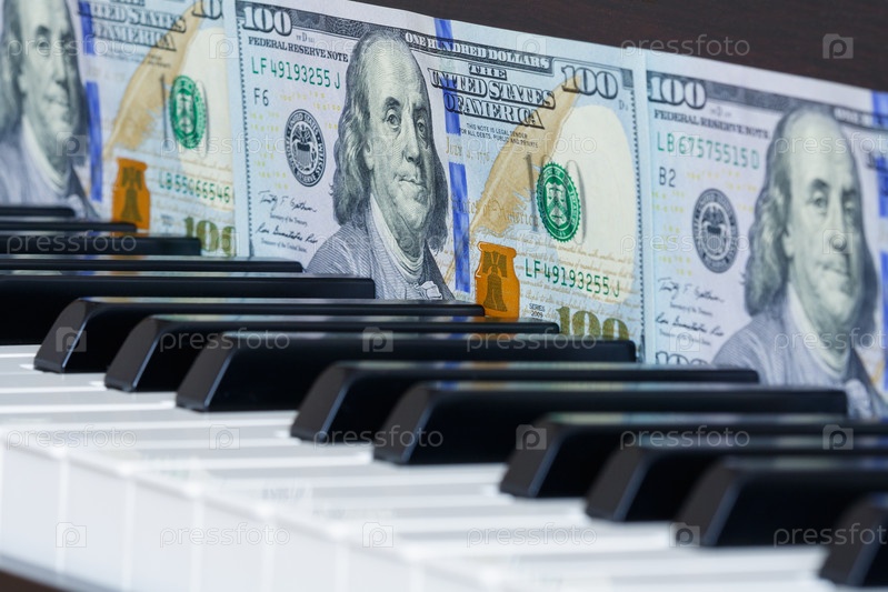 Ряд стодолларовых купюр перед клавишами фортепиано (концепция)