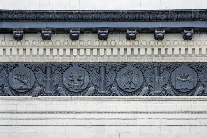 Москва, Россия, июнь 2018: фрагмент рельефного фриза на вершине триумфальной арки в Поклонной горе