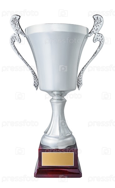 Серебряный кубок-трофей с двумя ручками и позолоченной бляшкой на основании, изолированный на белом фоне (элемент дизайна)