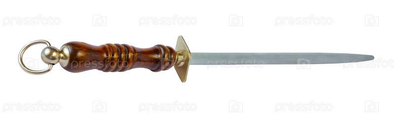 Точилка ножа с коричневой деревянной ручкой, изолированной на белом фоне (элемент дизайна)