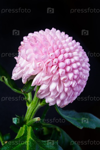 Закрыть вид на розовый сферический цветок хризантемы на черном фоне (вертикальная ориентация изображения)