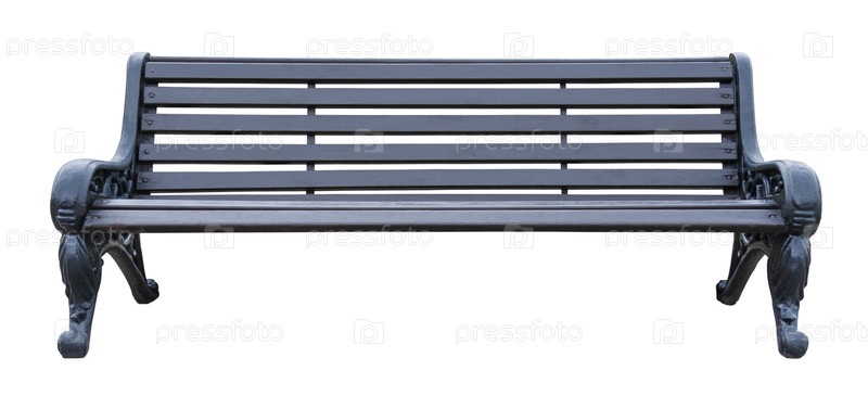 Вид спереди на серую деревянную скамейку с черными металлическими ножками с богато украшенными узорами, изолированными на белом фоне (элемент дизайна)