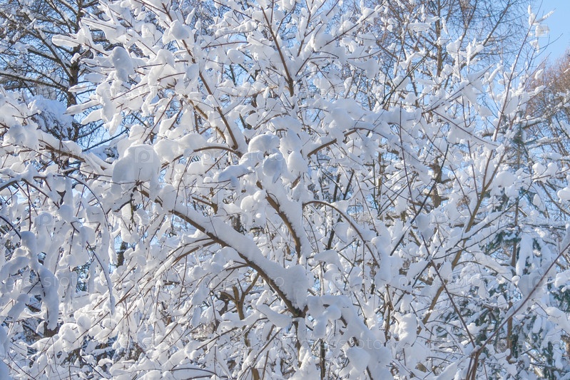 Ветви деревьев в зимнем лесу, покрытые снегом (фон)