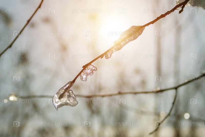 Закрыть вид замороженной сухой ветви против солнечного света (тонированный)