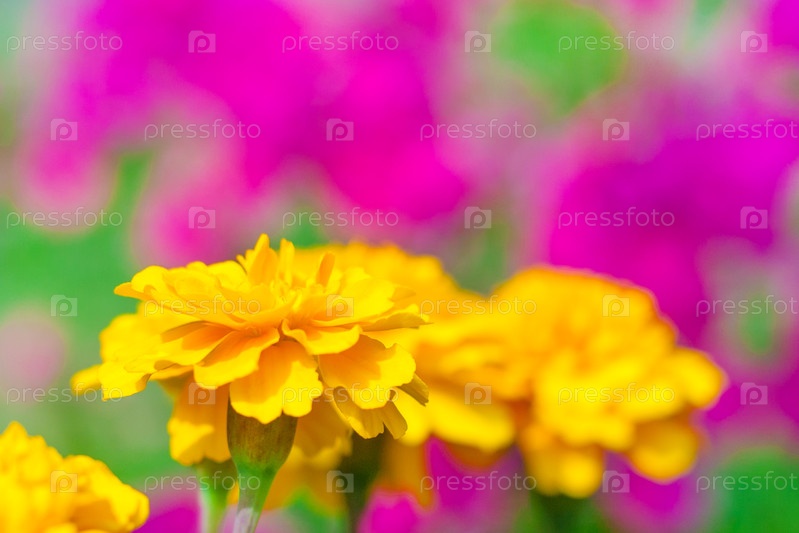 Закрыть вид на желтый цветок тагет (маригольд) на фоне розовых цветов в саду в размытии (копировать пространство, неглубокая глубина резкости)