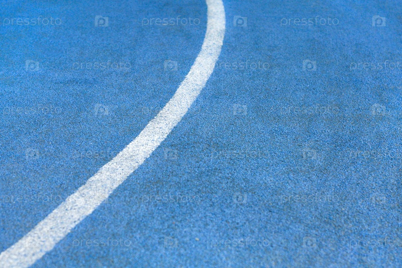 Фрагмент синей синтетической поверхности беговых дорожек легкоатлетического стадиона с белой линией в виде текстуры, фона (абстракт)
