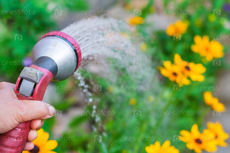 Закройте вид на руку с распылителем, полив желтые цветы в саду (небольшая глубина резкости)