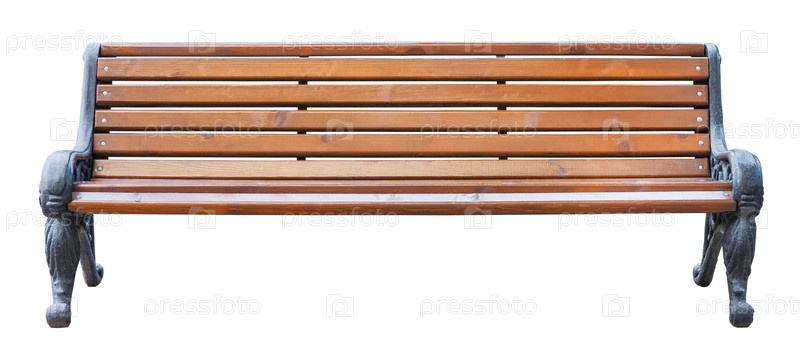 Вид спереди на коричневую деревянную скамейку с черными металлическими ножками, изолированными на белом фоне (элемент дизайна)